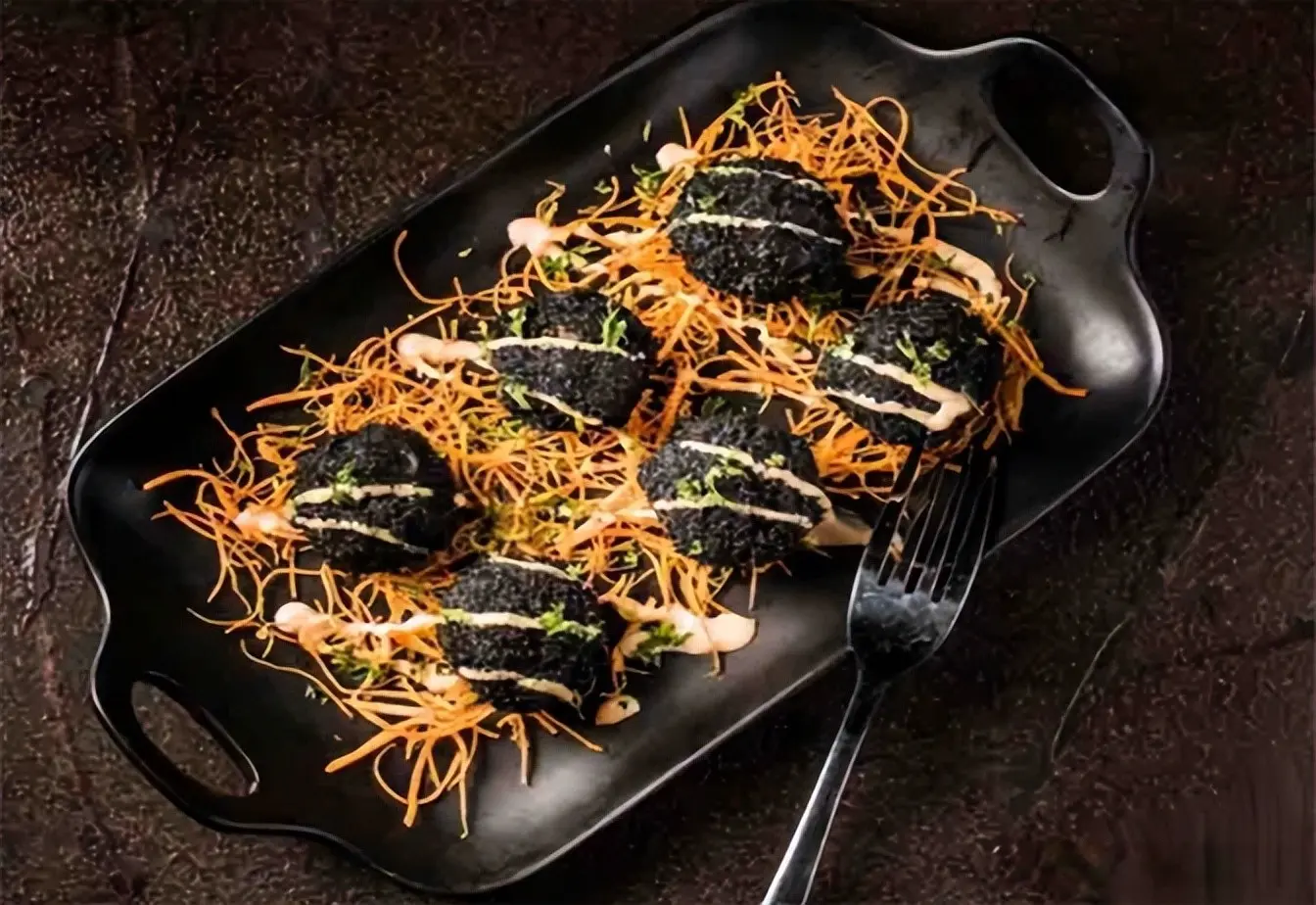 3、过三关,虾球沾面粉、蛋液,调制好的黑色面包糠依序制作即可,制作完成后 用120度的油温进行炸制。